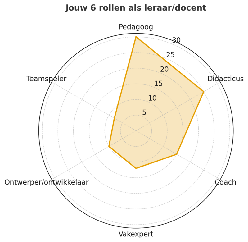 Naar aanleiding van mijn website en onderwijsstijl zijn de 6 rollen van mijn als leraar ingeschat en verdeeld naar verhouding. Dit profiel geeft inzicht in hoe ik functioneer als docent in mijn maritieme en didactische context.